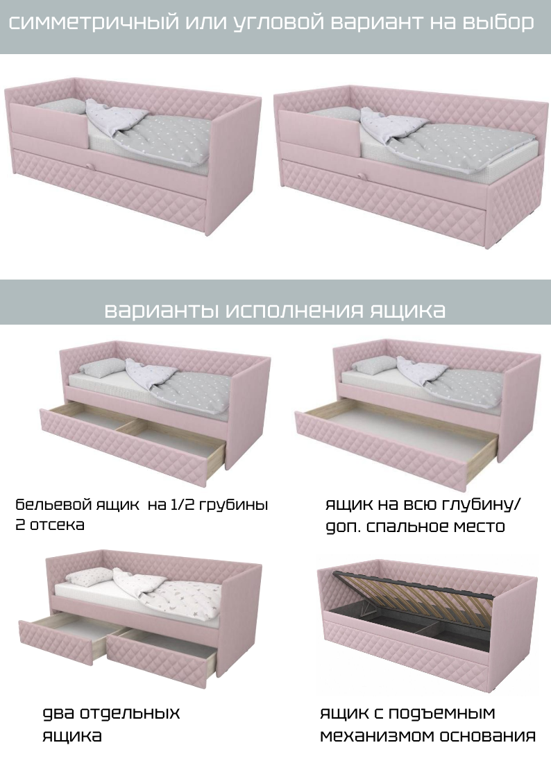 Мягкая кровать Роби - отличное решение для детской или подростковой комнаты. Собрать свой вариант кровати поможет наш конструктор опций. Вы можете выбрать необходимый размер, ящики, ткань, комплектацию, угол кровати. Модель можно выполнить в симметричном варианте с двумя боковинами или в угловом варианте, когда в ногах боковина низкая.